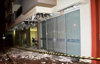 Usando material explosivo, homens ainda não identificados danificaram um prédio localizado na rua Guarporé, esquina com a avenida Bento Gonçalves, em Ametista do Sul. O fato ocorreu por volta das 2h30min deste domingo, 6, segundo moradores próximos, que acordaram com o barulho.